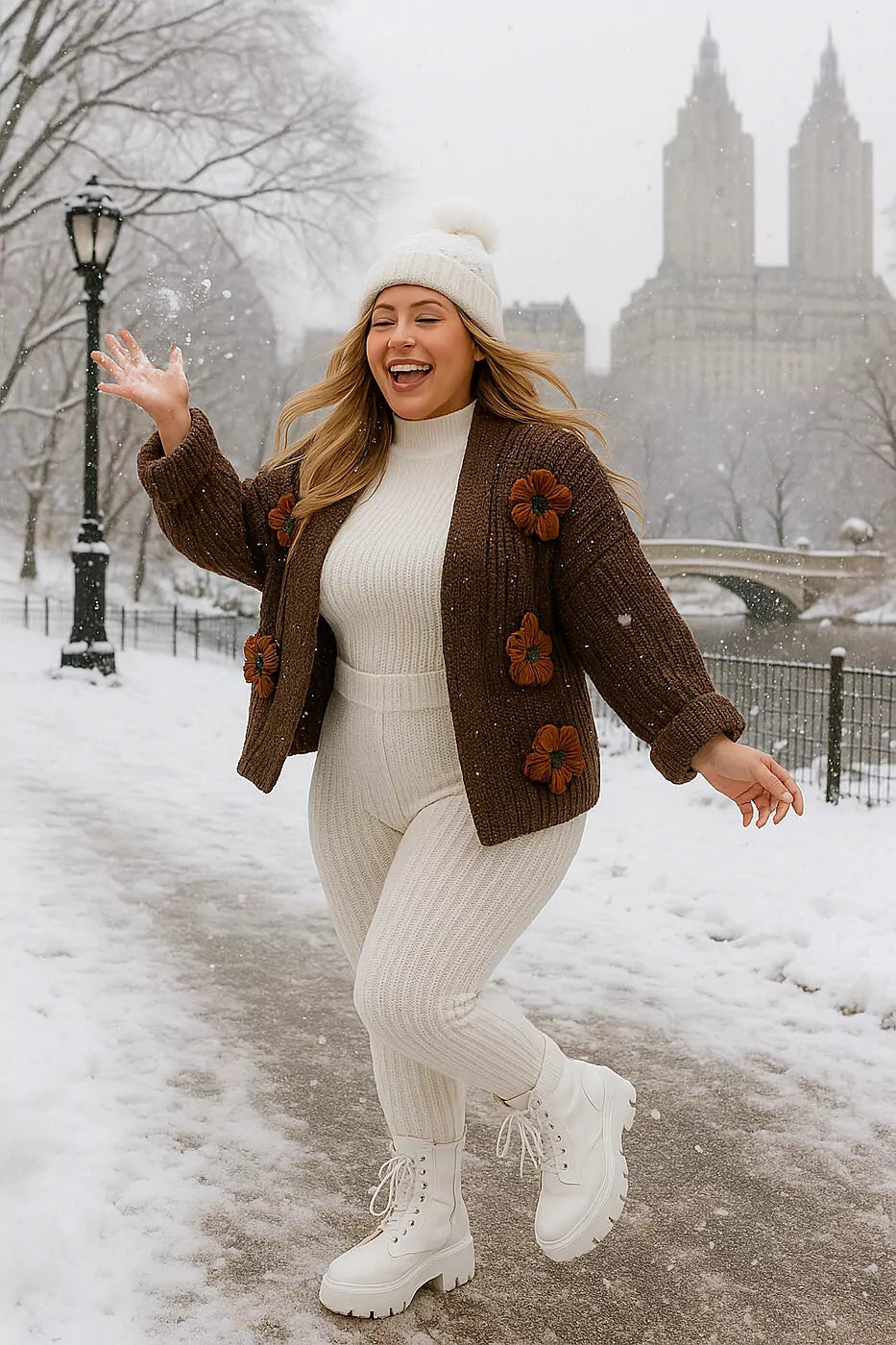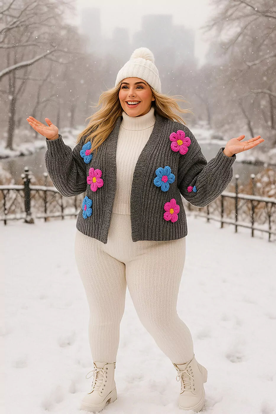 Cardigan de tricô grosso com aplicação de flores coloridas em crochê (rosa e azul), sem fechamento frontal e modelagem soltinha. Ideal para looks de inverno alegres e confortáveis.