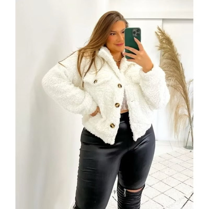 Este casaco teddy peluciado combina conforto, estilo e muito charme. Com textura macia e quentinha, é perfeito para os dias mais frios sem perder a elegância.