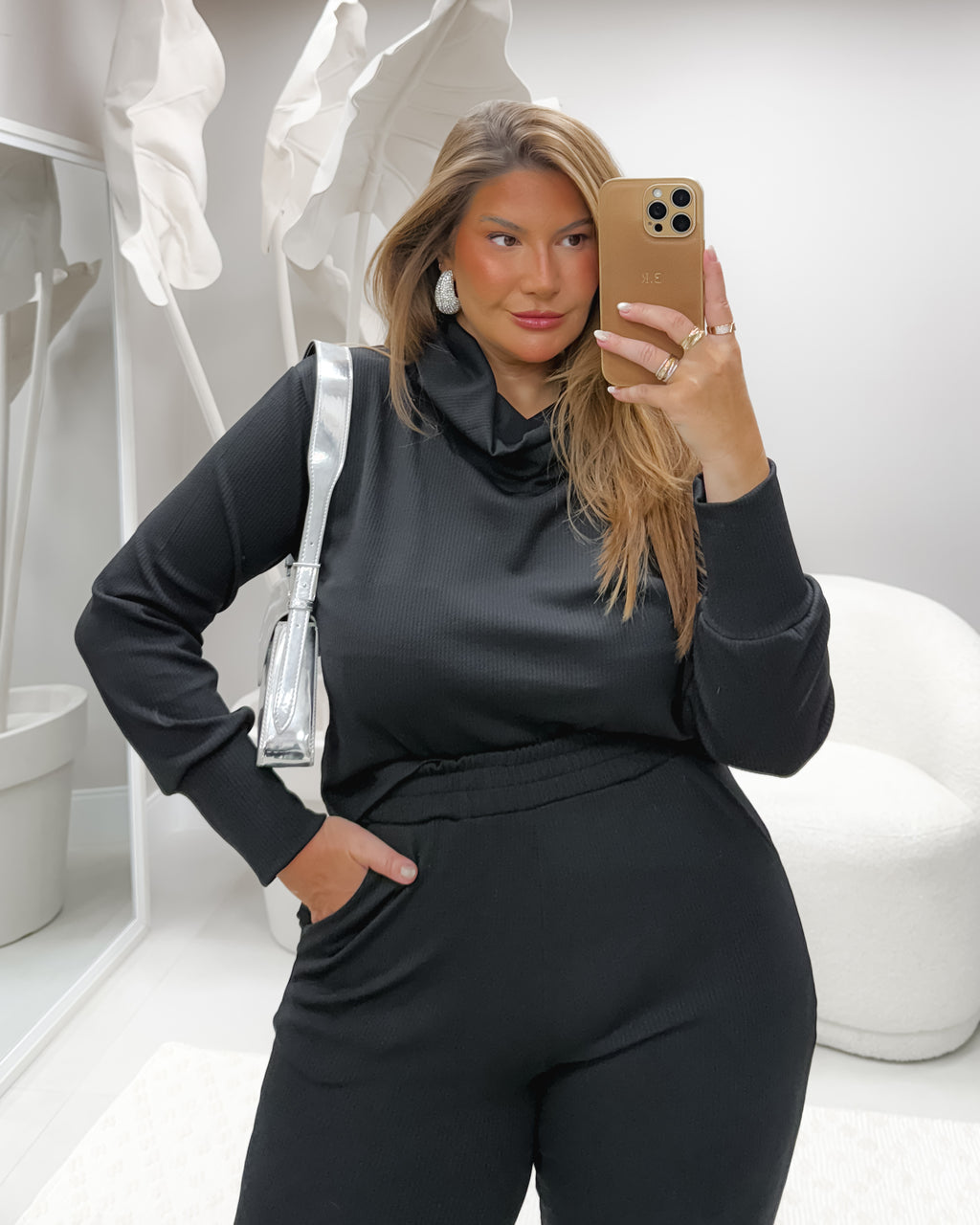 Conjunto em tecido Ana Ruga com elasticidade, disponível no preto e nos tamanhos