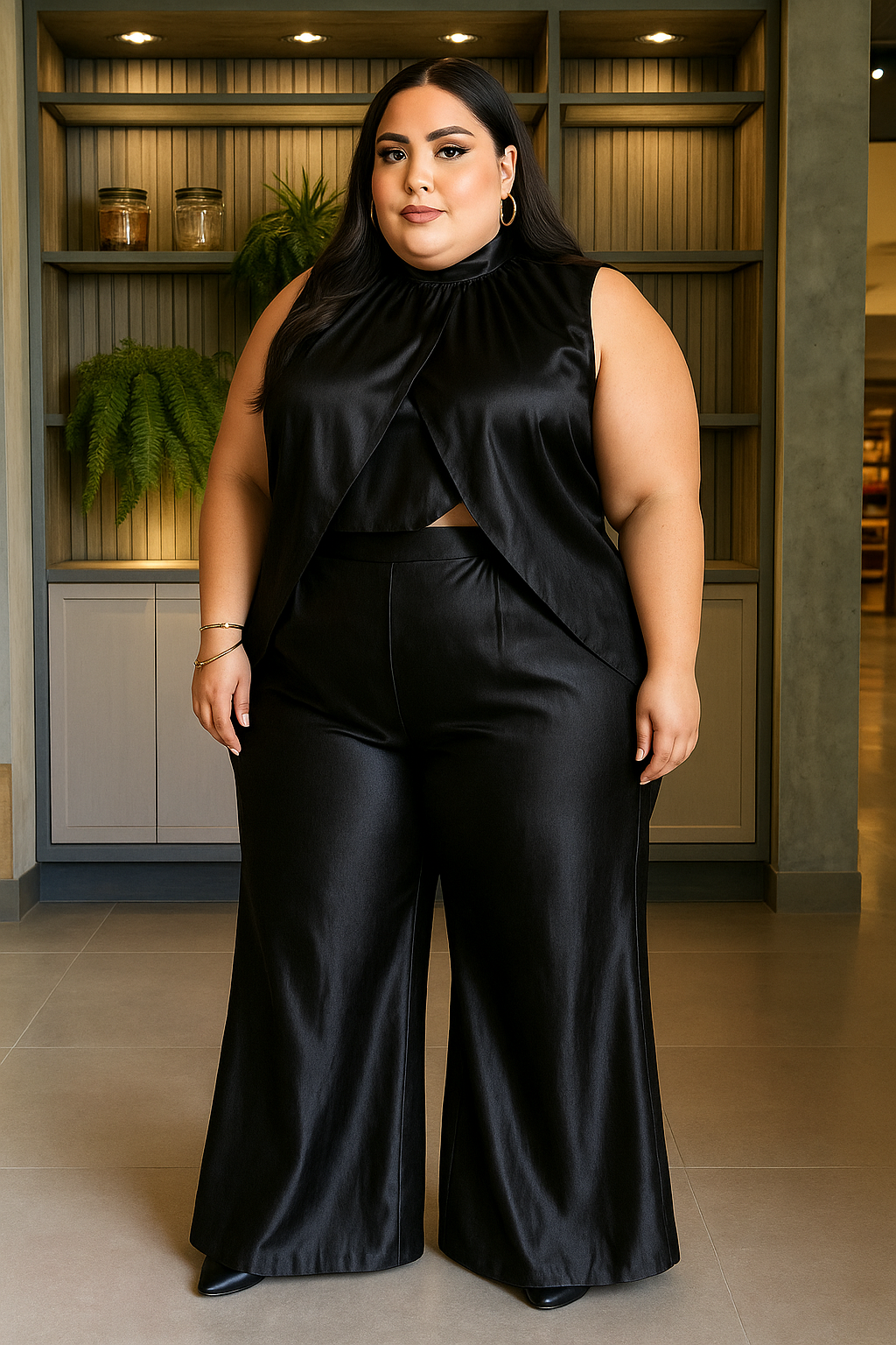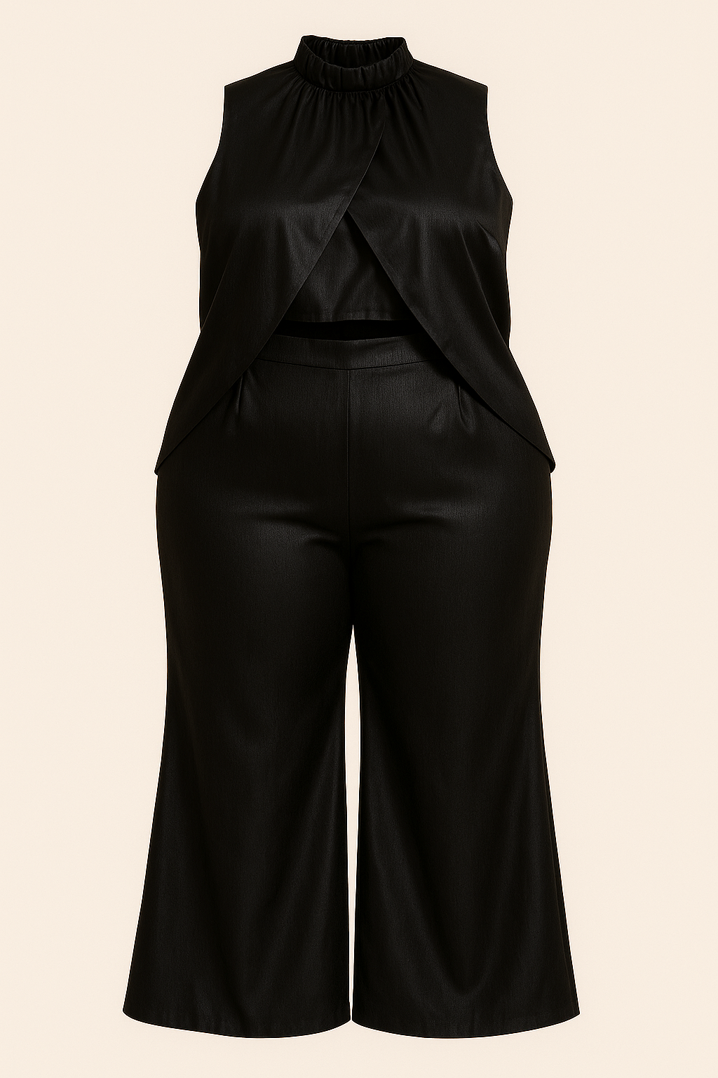 Conjunto elegante em tecido acetinado, com blusa de gola alta e recorte frontal. Calça pantacourt de cintura alta com caimento leve. Sofisticação e conforto em uma peça só.