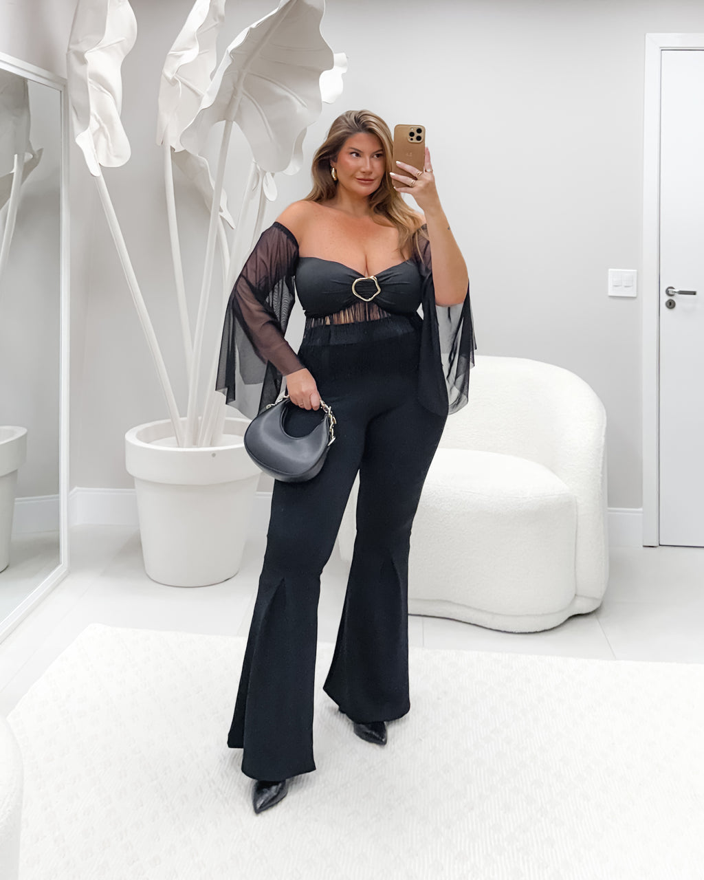 Cropped com bojo, fivela central e mangas de tule. Disponível.