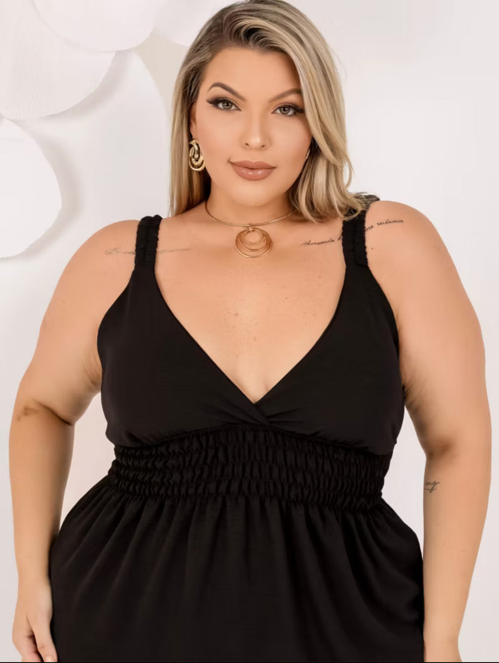 Vestido feminino curto, possui decotes em "V", alças com elástico para regulagem e ajuste na cintura com lastex.